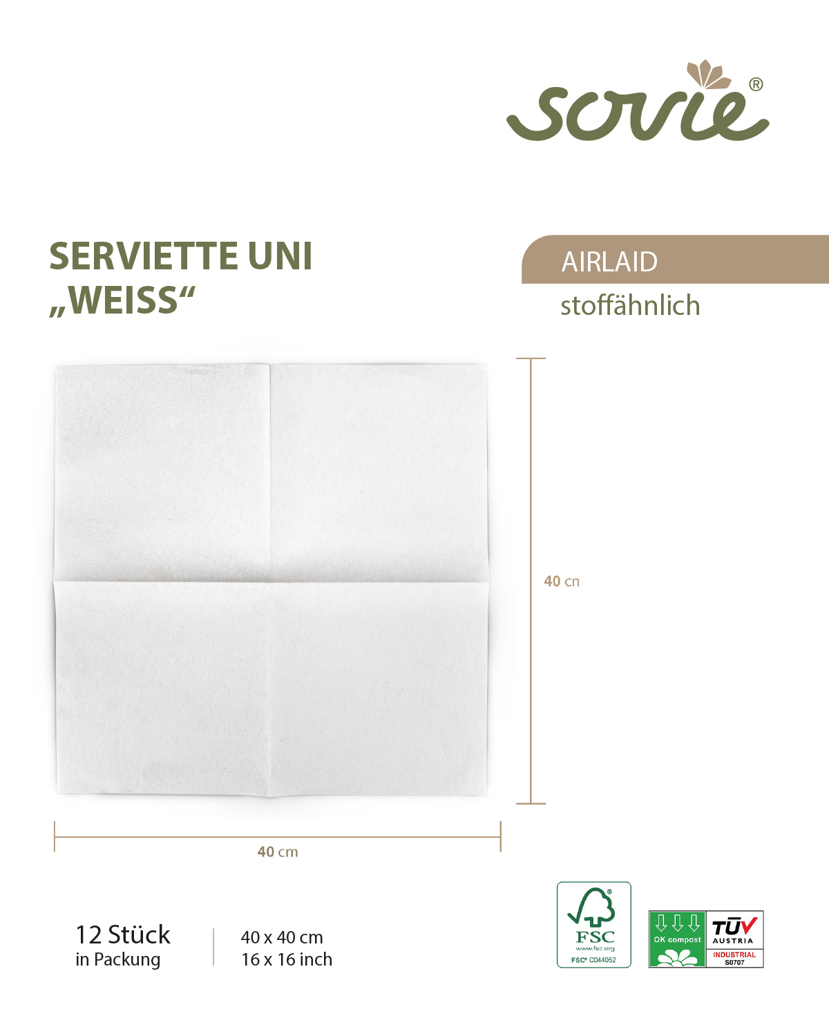 In der Packung befinden sich 12 Stück, was sie zu einer praktischen Lösung für kleinere Veranstaltungen oder als stilvolle Ergänzung für Ihre Tischdekoration zuhause macht. Die klassische WEISS-Farbe in Kombination mit dem hochwertigen Linclass® Airlaid-Material sorgt für eine geschmackvolle und elegante Tischgestaltung, die jedes Event zu einem besonderen Erlebnis macht.