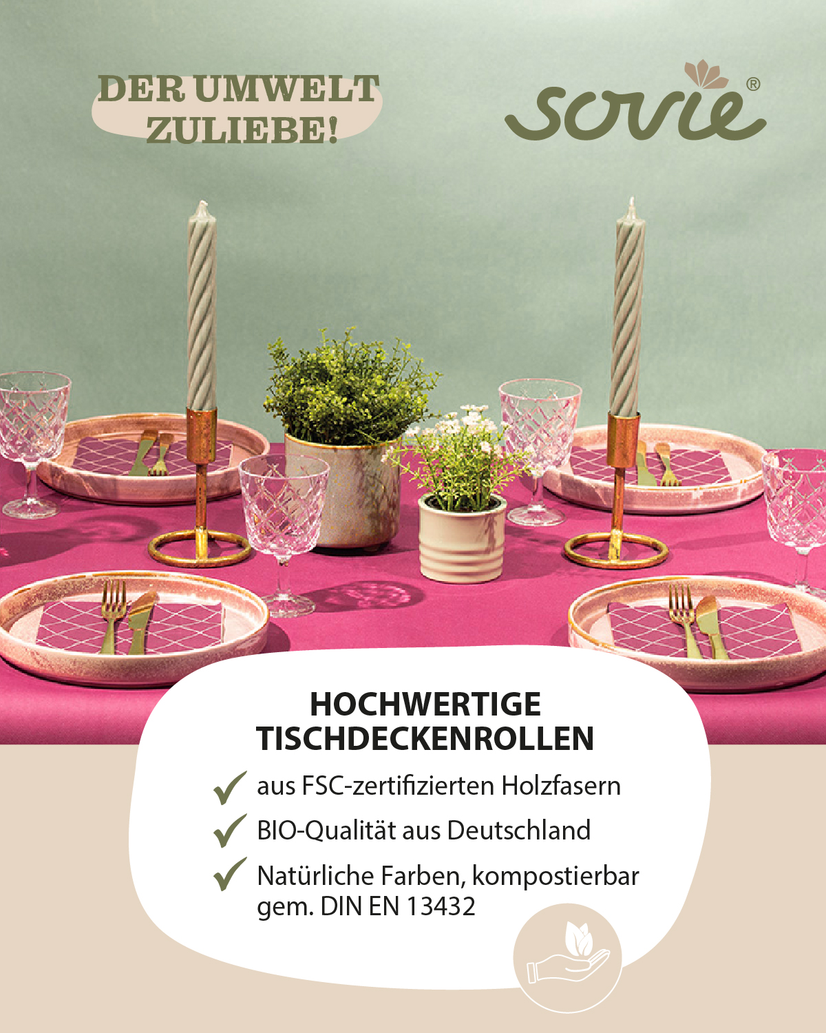 Nach der Veranstaltung überzeugt die Linclass®-Airlaid Tischdeckenrolle in Violett durch ihre einfache Handhabung. Sie lässt sich nach Gebrauch problemlos entsorgen, was den Aufräumprozess erheblich erleichtert. Diese Tischdeckenrolle kombiniert eine kräftige, stilvolle Farbgebung mit hoher Funktionalität und praktischer Flexibilität, wodurch sie zur idealen Wahl für Gastgeber wird, die sowohl Ästhetik als auch Benutzerfreundlichkeit schätzen. Mit der Linclass®-Airlaid Tischdeckenrolle in Violett verleihen Sie Ihrer Veranstaltung eine unverwechselbare und luxuriöse Atmosphäre, die Ihren Gästen lange in Erinnerung bleiben wird.