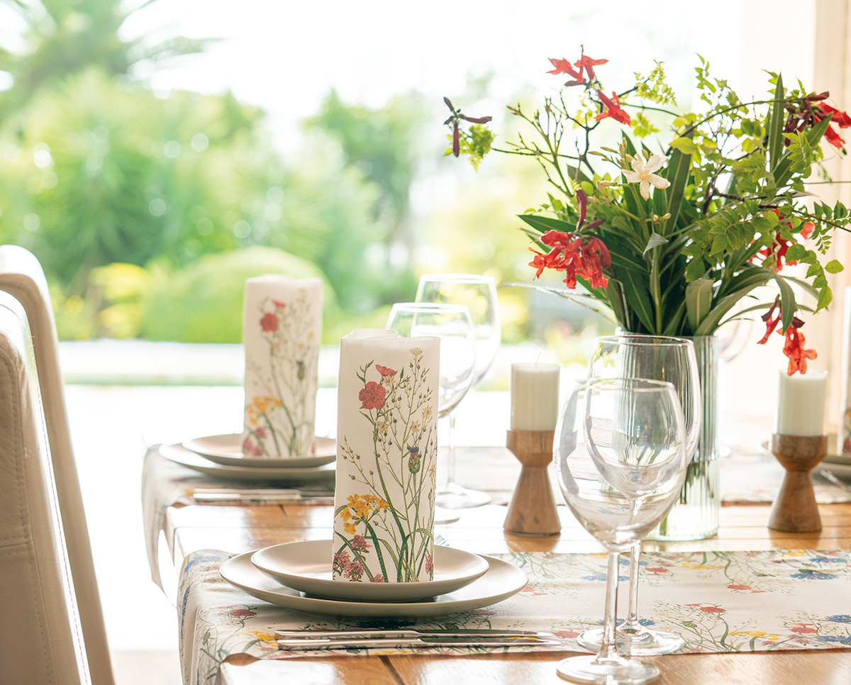 Das liebevoll gestaltete Design mit Wildblumen wie Klatschmohn, Schafgarbe und Astern bringt eine natürliche und lebendige Atmosphäre auf jeden Tisch. Auf dem weißen Hintergrund kommen die farbenfrohen Blüten besonders schön zur Geltung und verleihen jeder Dekoration eine frische, sommerliche Note. Ideal für Gartenfeste, Hochzeiten, Geburtstage oder saisonale Anlässe.