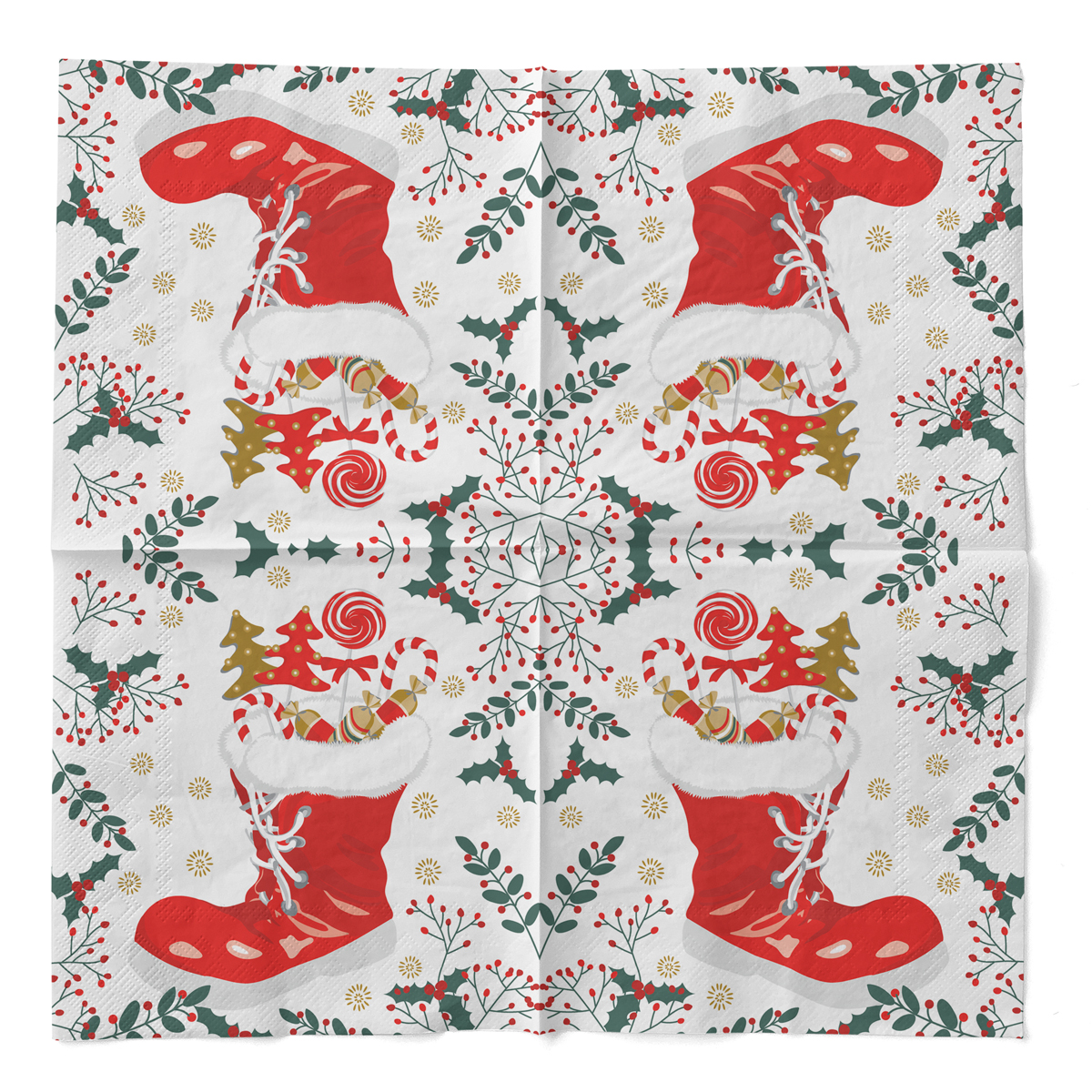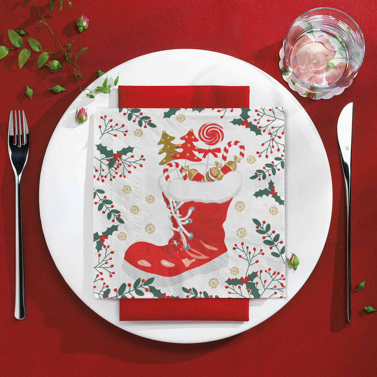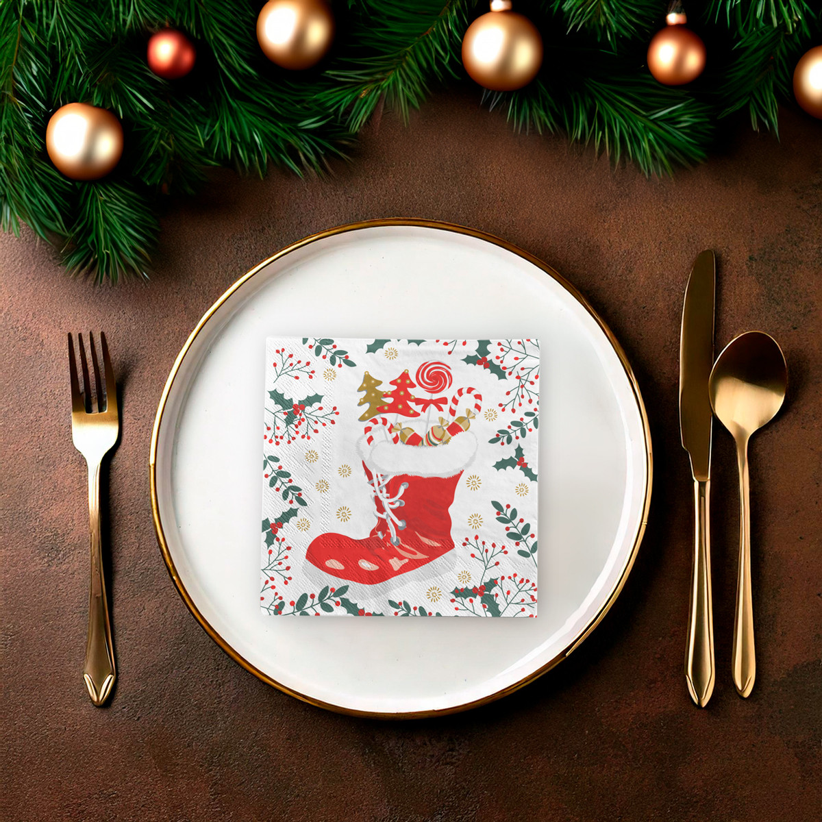 Die Serviette "CHRISTMAS SWEETS" begeistert mit ihrem festlichen Design: Ein Nikolausstiefel, prall gefüllt mit Süßigkeiten, umrahmt von Ilexzweigen und Schneeflocken. Die dreilagige Tissue-Qualität macht die Serviette besonders saugfähig und robust. Sie verleiht jedem Weihnachtstisch eine liebevolle, stimmungsvolle Note.