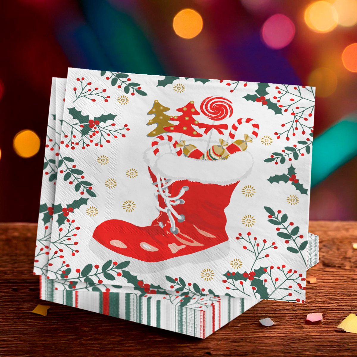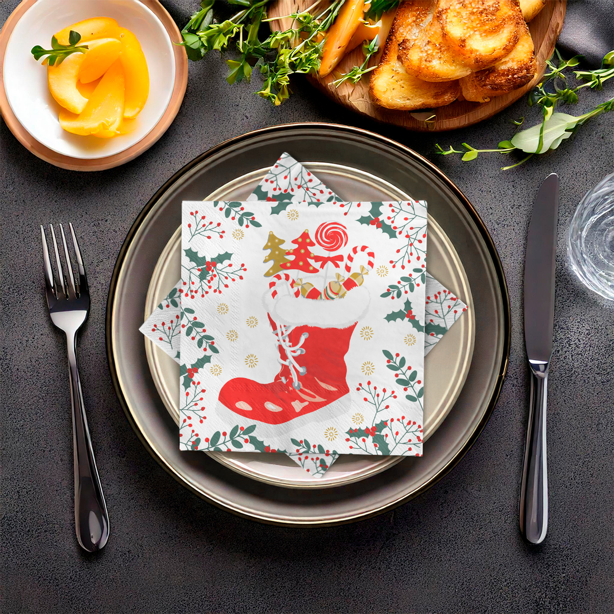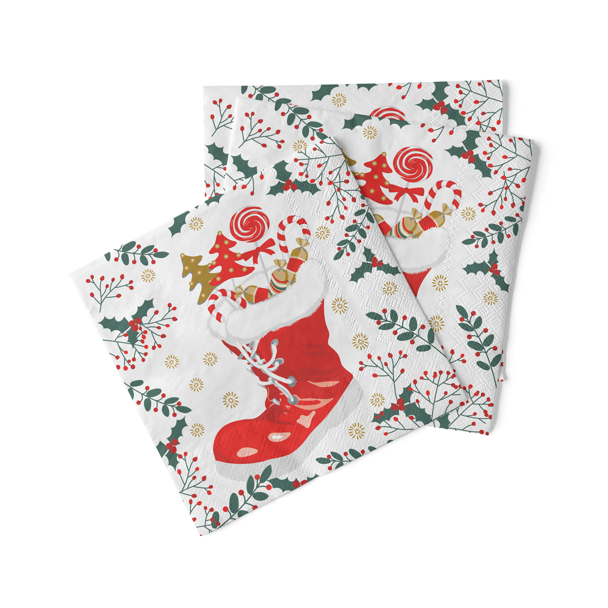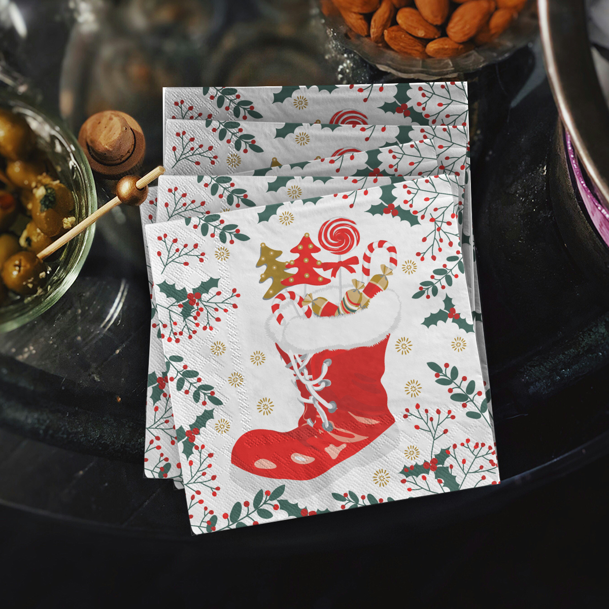 Die Serviette "CHRISTMAS SWEETS" begeistert mit ihrem festlichen Design: Ein Nikolausstiefel, prall gefüllt mit Süßigkeiten, umrahmt von Ilexzweigen und Schneeflocken. Die dreilagige Tissue-Qualität macht die Serviette besonders saugfähig und robust. Sie verleiht jedem Weihnachtstisch eine liebevolle, stimmungsvolle Note.