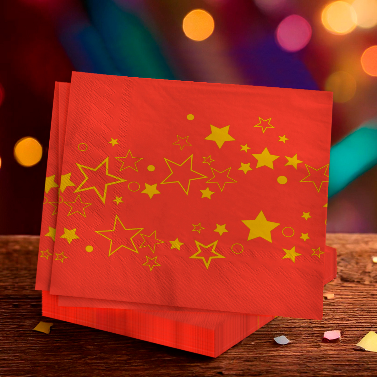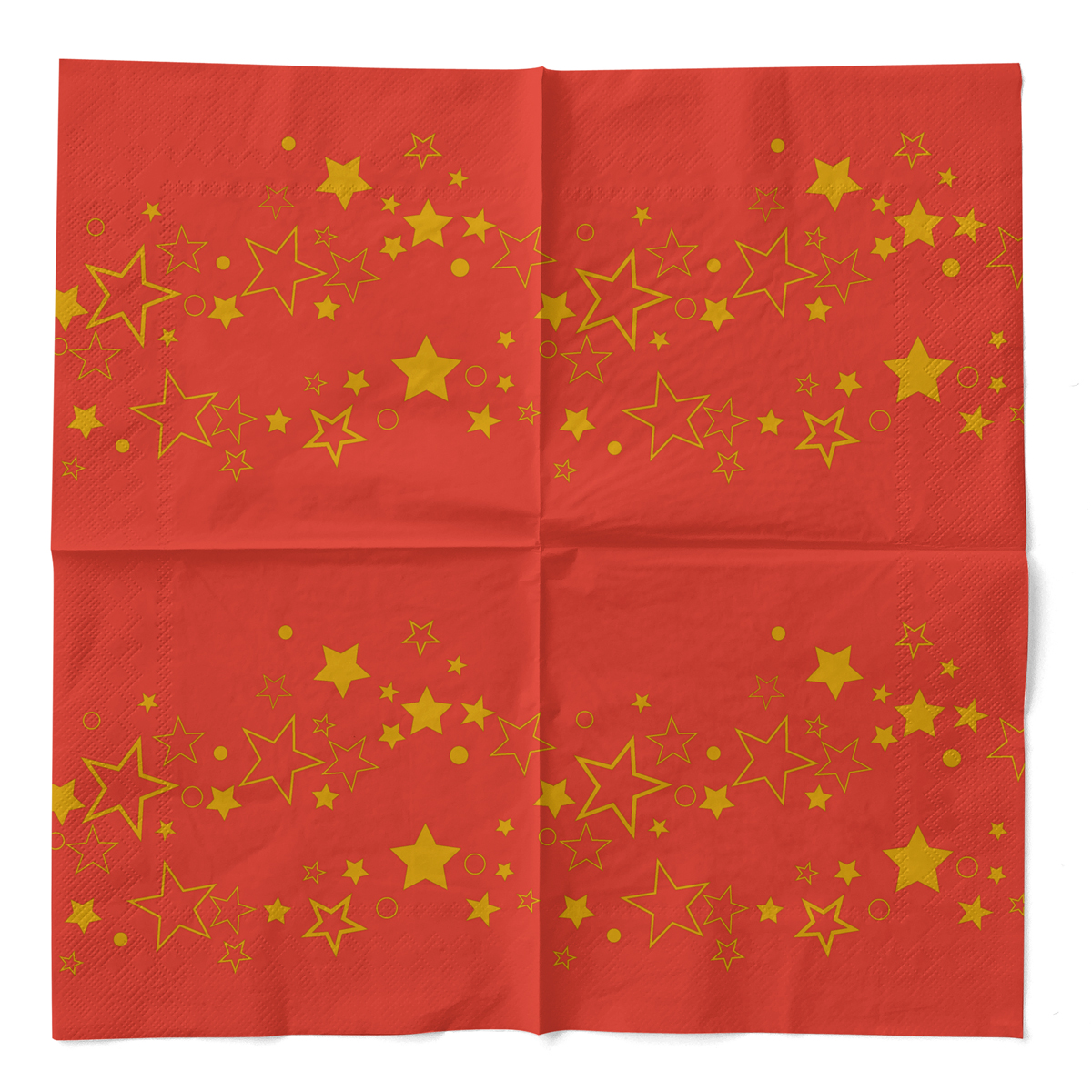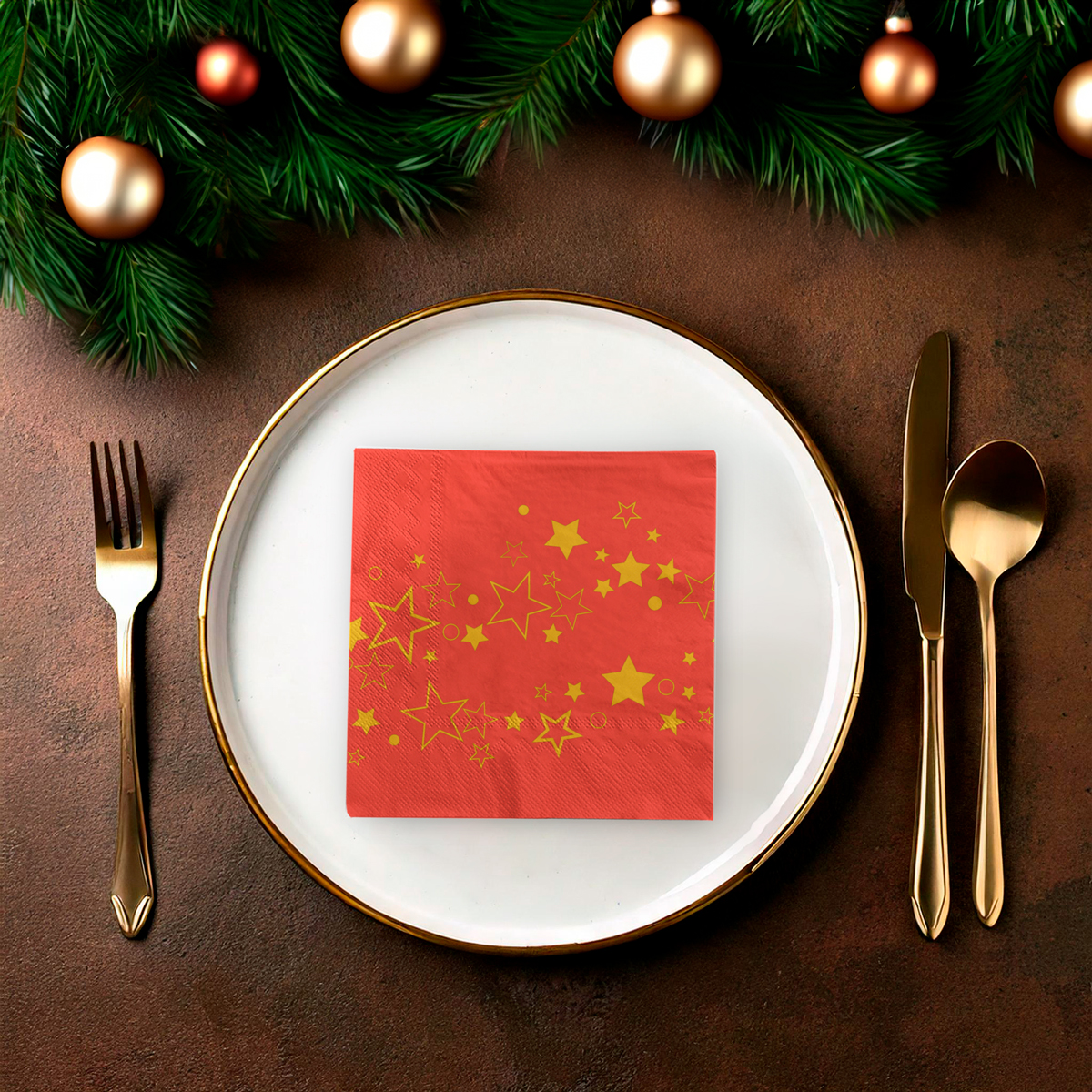 Die Serviette "GALAXY ROT-GOLD" besticht durch ihr festliches Design mit goldenen Weihnachtssternen auf einem leuchtend roten Hintergrund. Die dreilagige Tissue-Qualität sorgt für besondere Saugfähigkeit und Stabilität. Sie verleiht jedem Weihnachtstisch eine elegante und glamouröse Note.