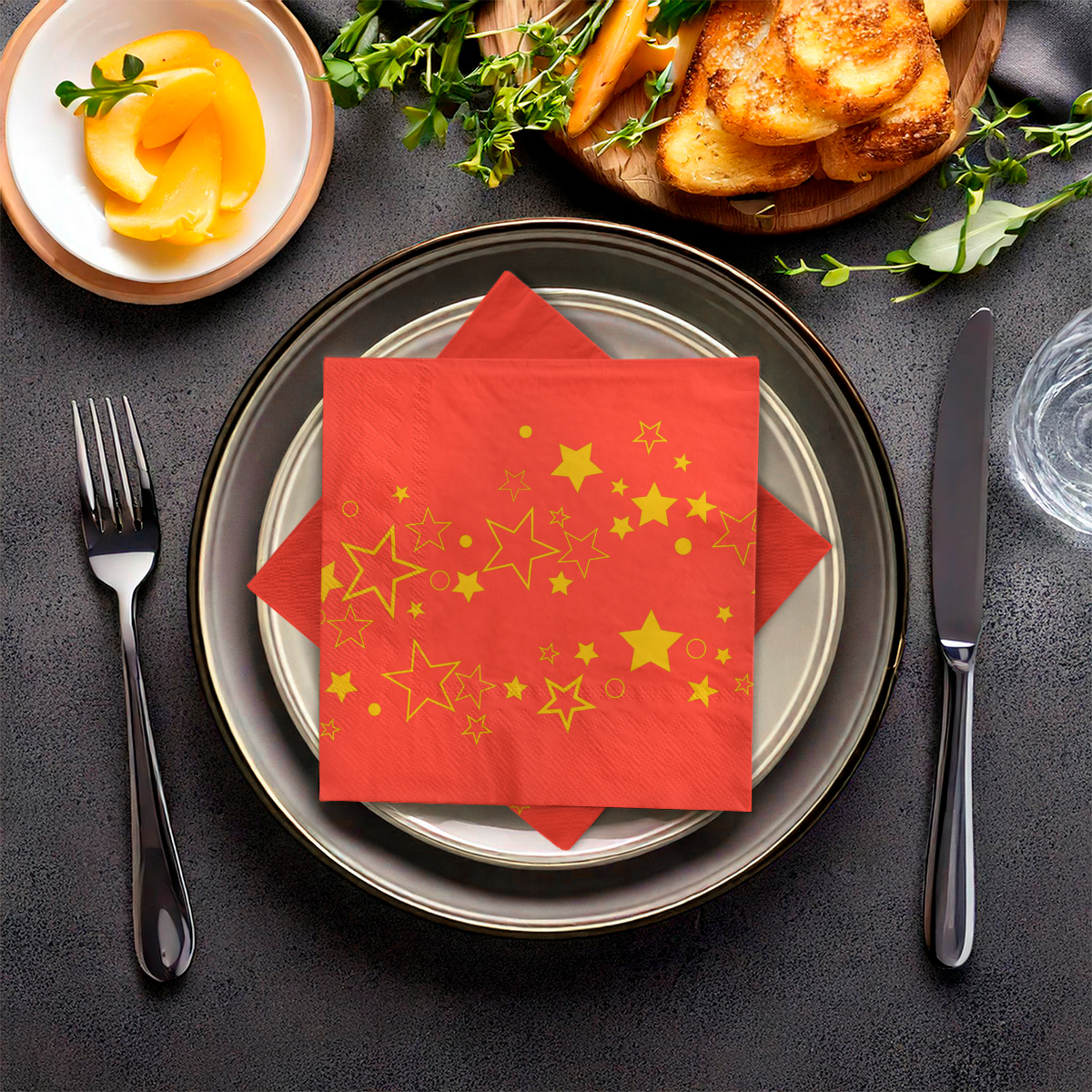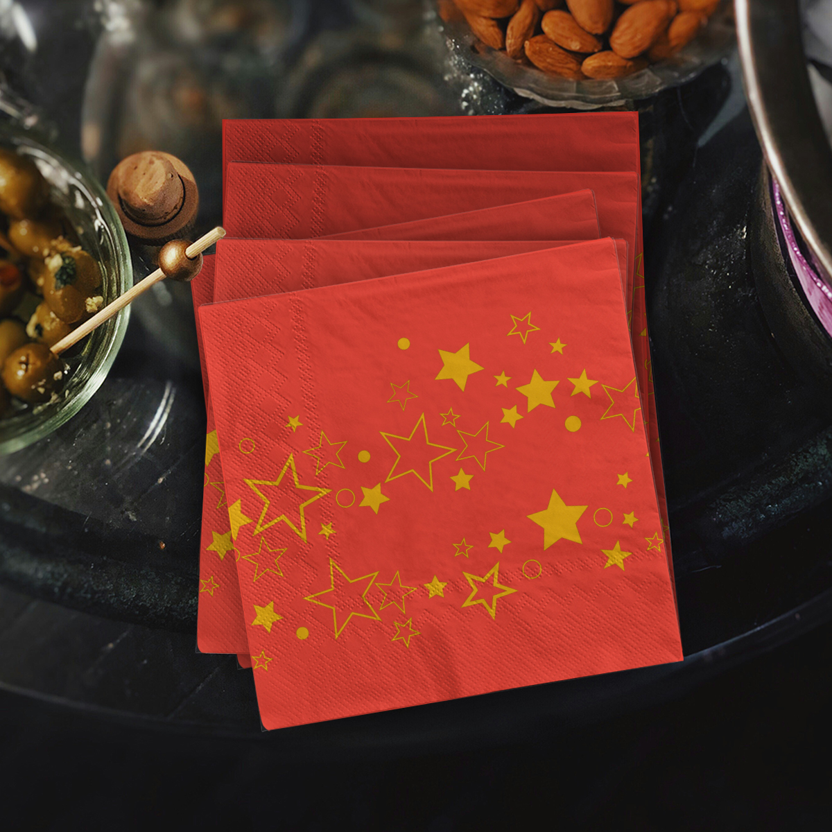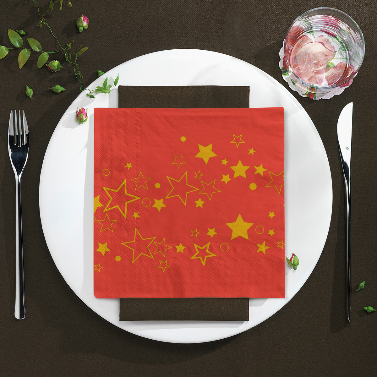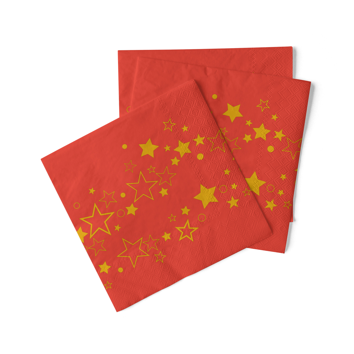 Die Serviette "GALAXY ROT-GOLD" besticht durch ihr festliches Design mit goldenen Weihnachtssternen auf einem leuchtend roten Hintergrund. Die dreilagige Tissue-Qualität sorgt für besondere Saugfähigkeit und Stabilität. Sie verleiht jedem Weihnachtstisch eine elegante und glamouröse Note.