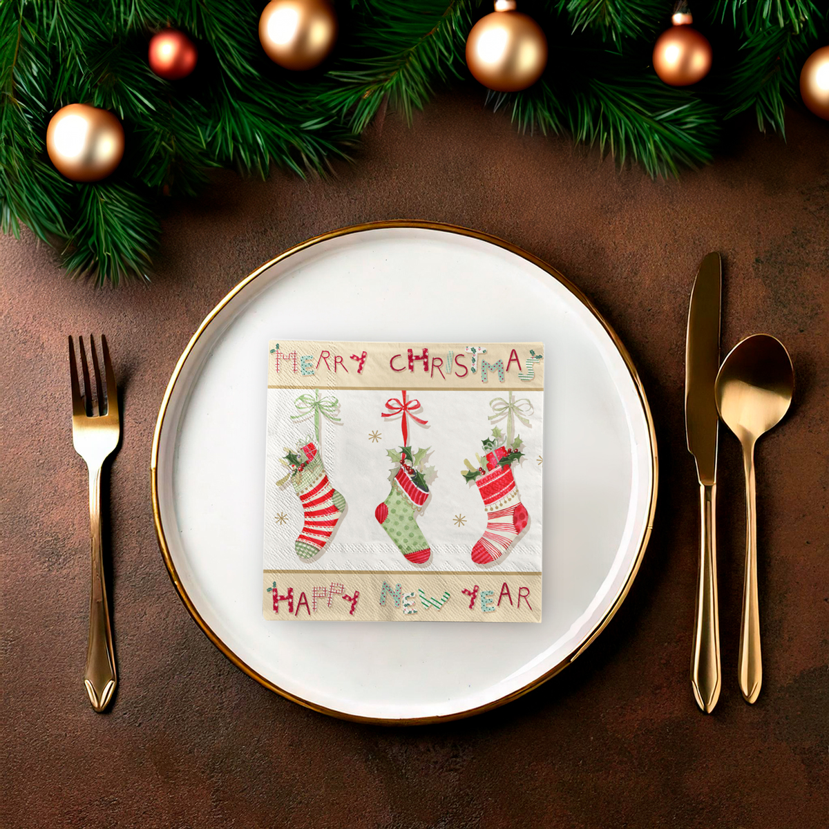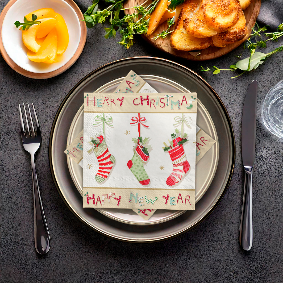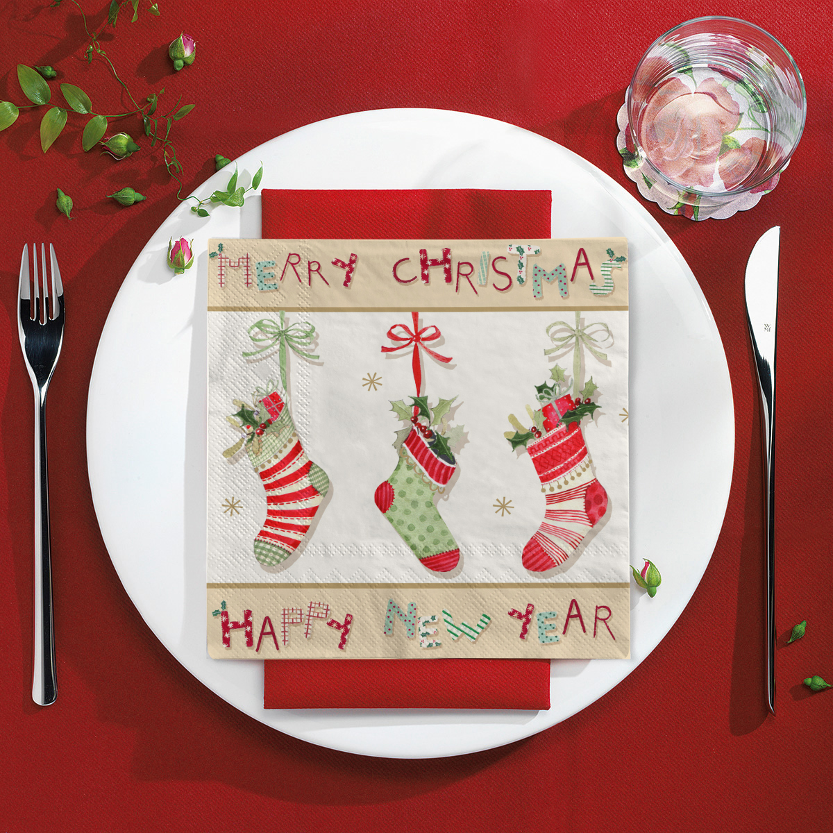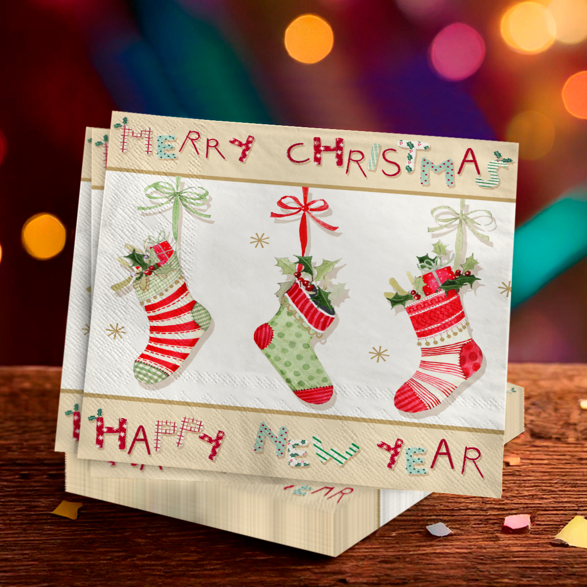 Die Servietten "SANTAS SOCKS" bringen mit ihrem liebevollen Design weihnachtliche Stimmung auf jede Tafel. Drei dekorative Strickstrümpfe, verziert mit Schleifen, zieren das Motiv und werden durch den Schriftzug „Happy Christmas – Happy New Year“ festlich ergänzt. Damit schaffen die Servietten eine warme und einladende Atmosphäre für Ihre Gäste.