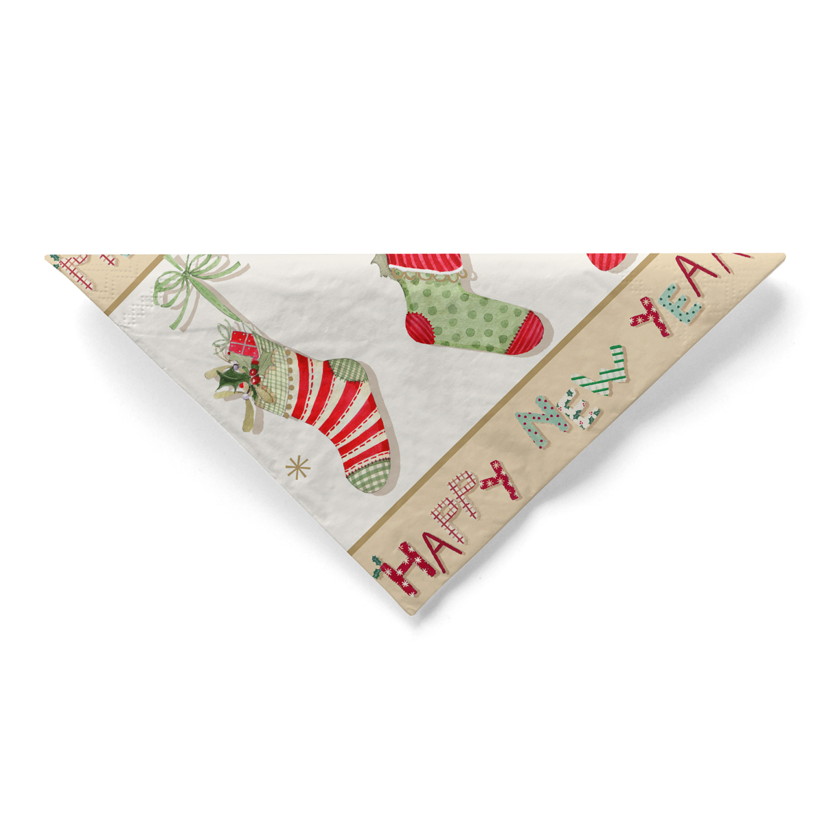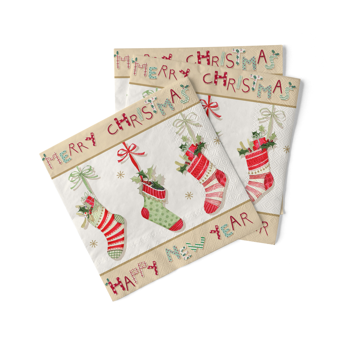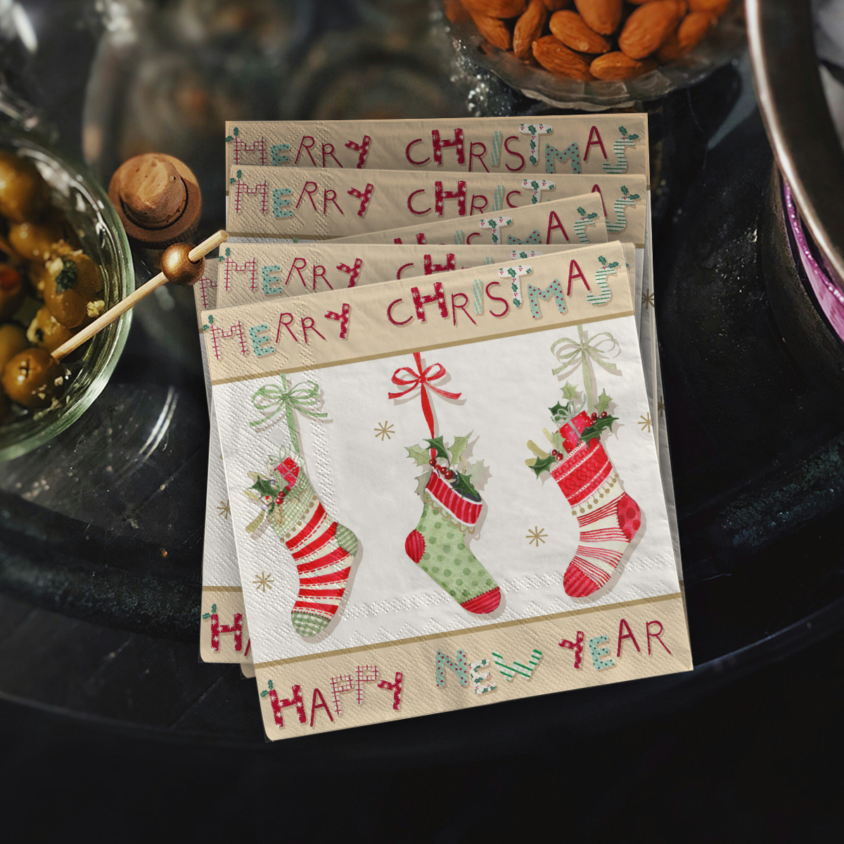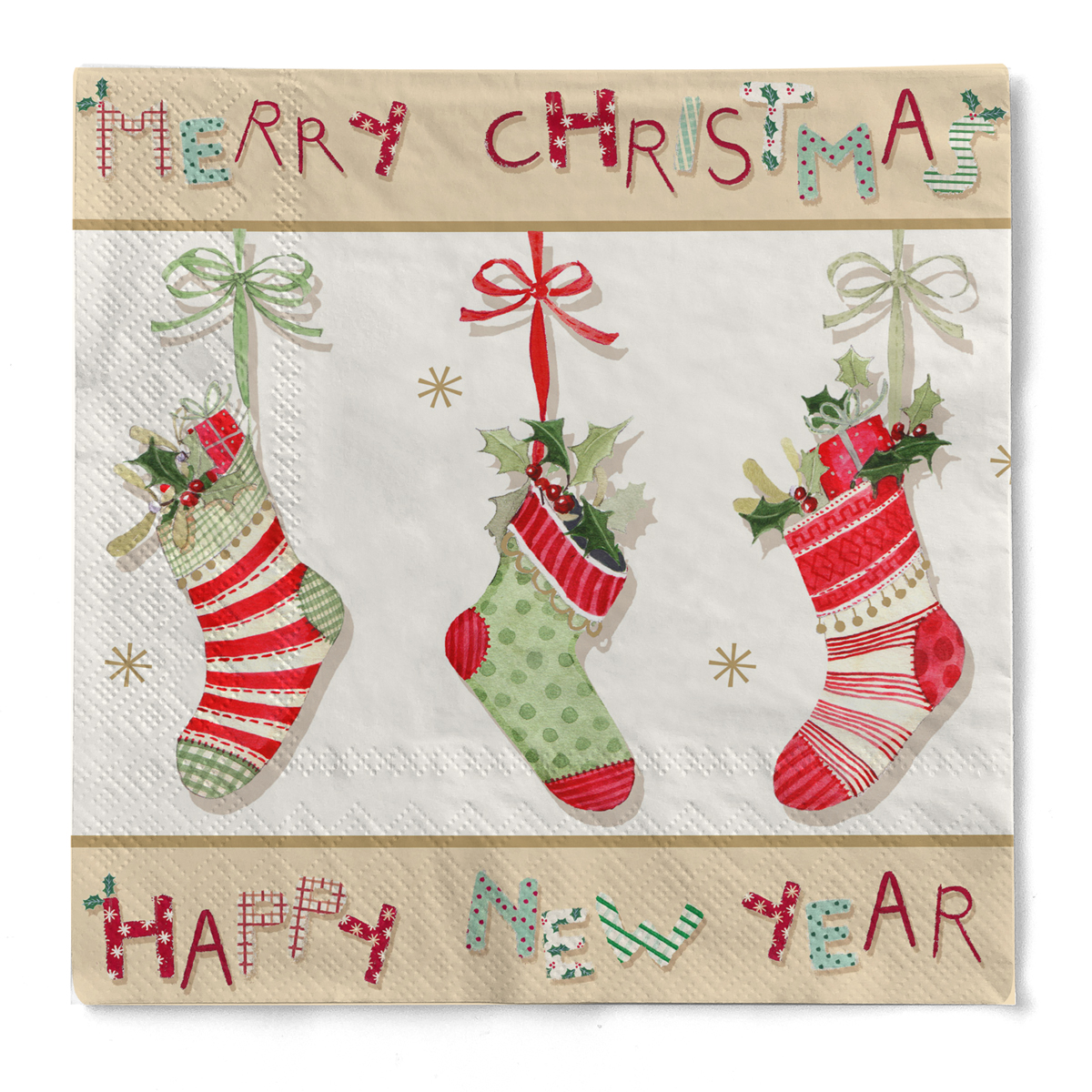 Die Servietten "SANTAS SOCKS" bringen mit ihrem liebevollen Design weihnachtliche Stimmung auf jede Tafel. Drei dekorative Strickstrümpfe, verziert mit Schleifen, zieren das Motiv und werden durch den Schriftzug „Happy Christmas – Happy New Year“ festlich ergänzt. Damit schaffen die Servietten eine warme und einladende Atmosphäre für Ihre Gäste.