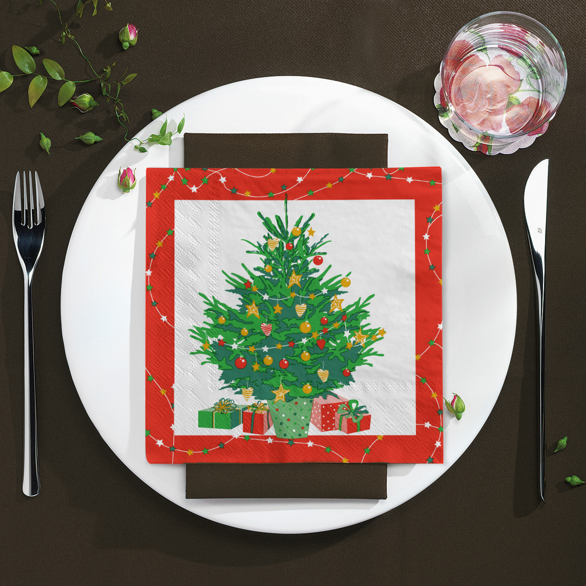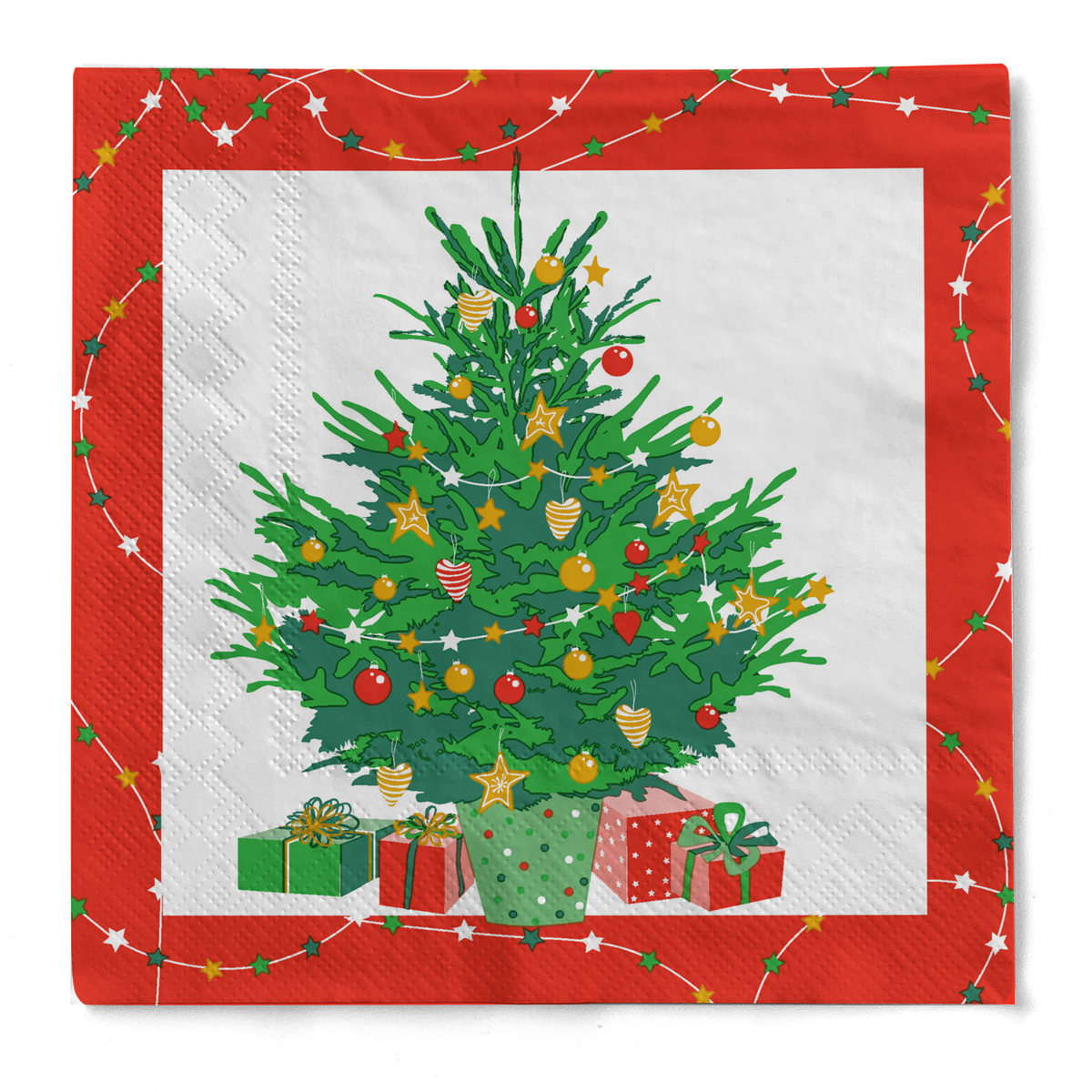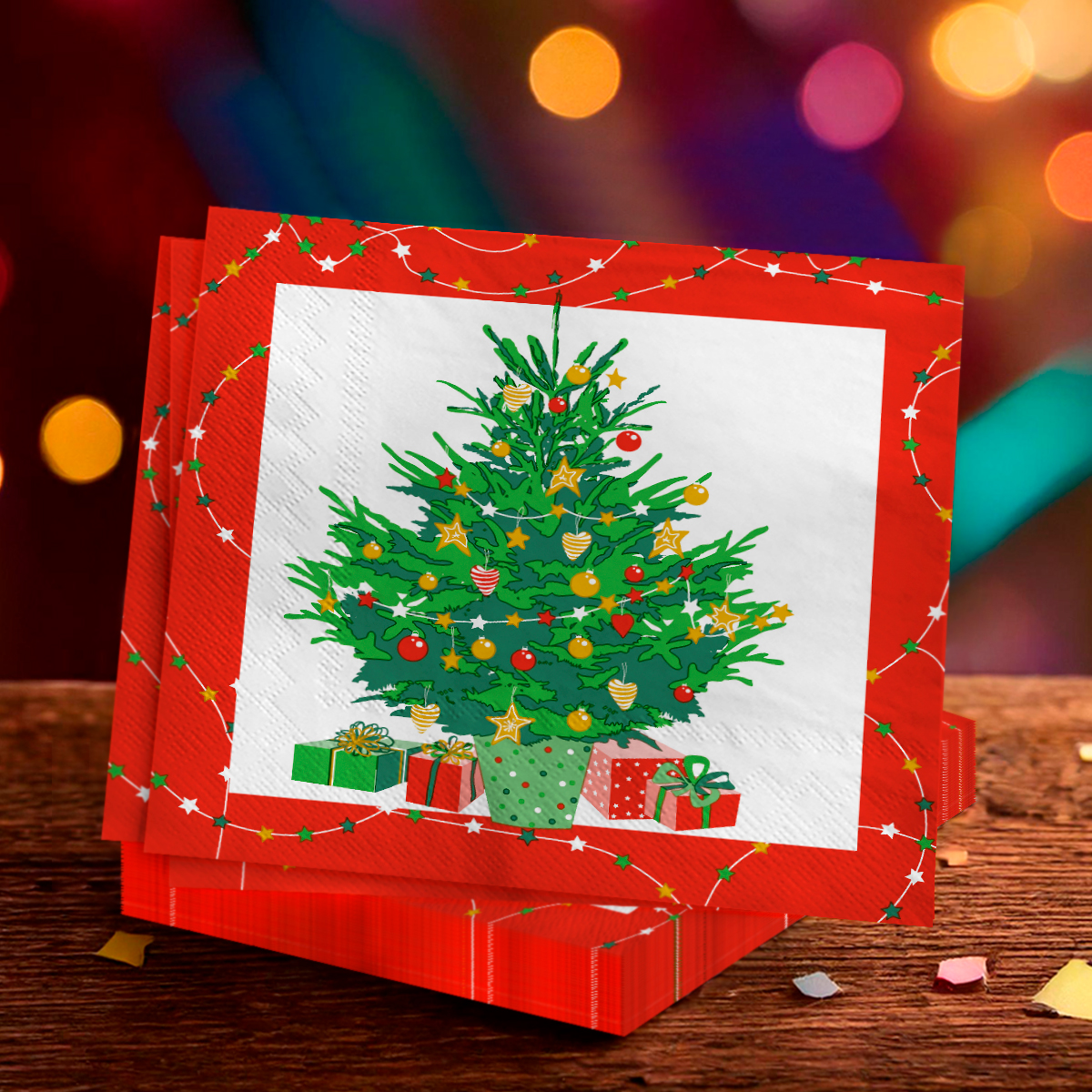 Die Serviette "Weihnachtsbaum" besticht durch ihr liebevolles Design eines geschmückten Tannenbaums, umgeben von hübsch verpackten Geschenken. Mit ihren 3 Lagen aus hochwertigem Tissue-Papier ist sie besonders saugfähig und strapazierfähig. Sie sorgt für ein festliches Ambiente auf jedem Weihnachtstisch, egal ob zu Hause oder bei der Weihnachtsfeier.