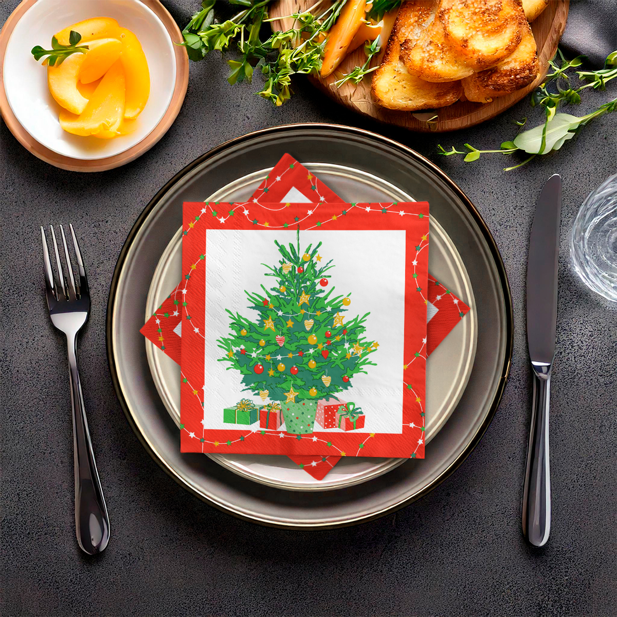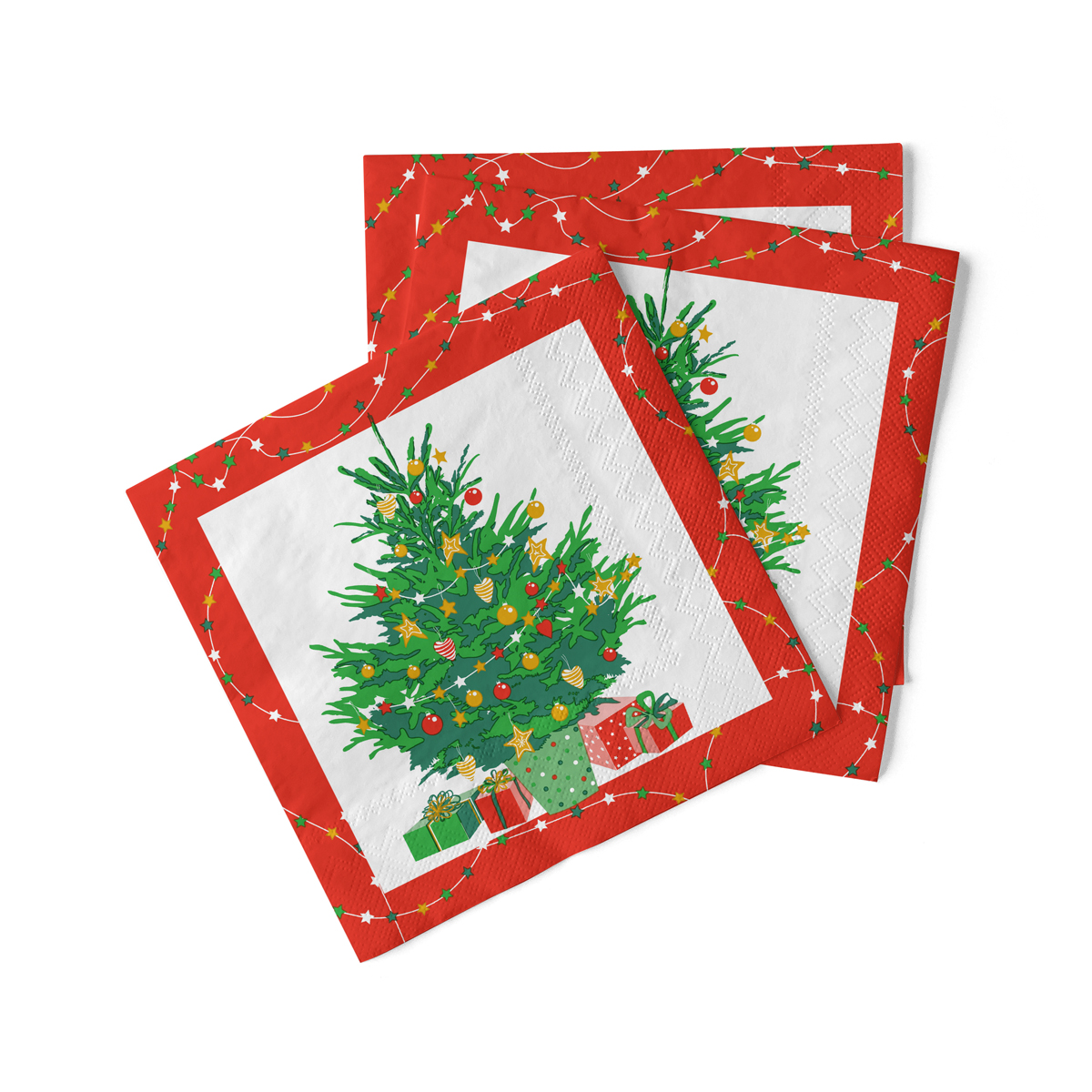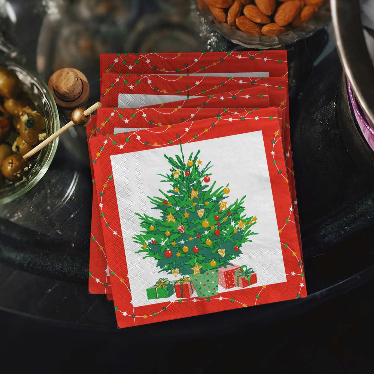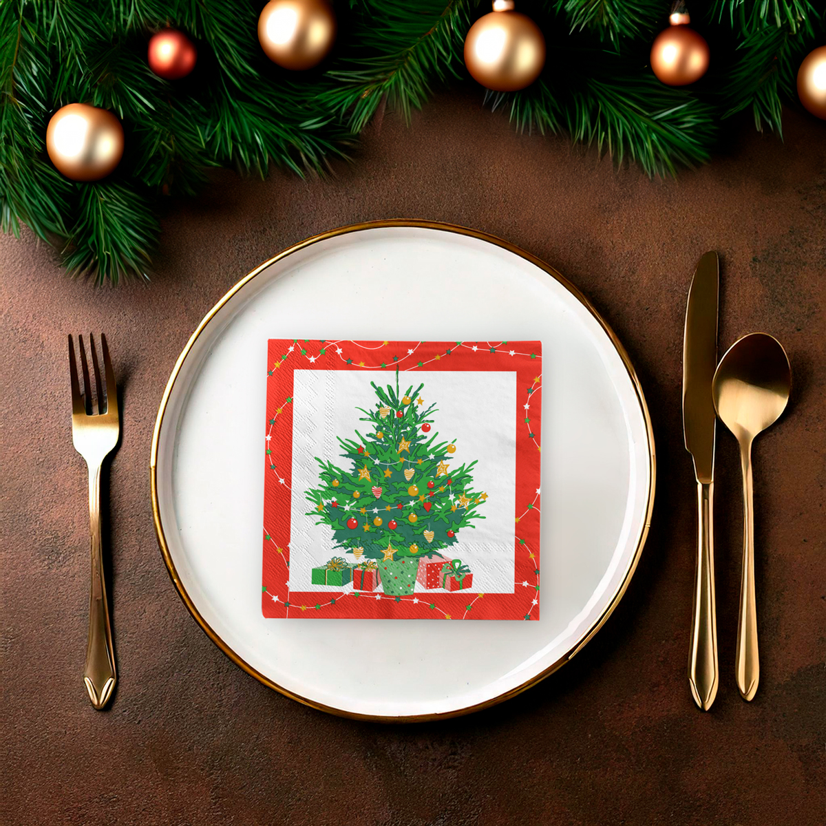 Die Serviette "Weihnachtsbaum" besticht durch ihr liebevolles Design eines geschmückten Tannenbaums, umgeben von hübsch verpackten Geschenken. Mit ihren 3 Lagen aus hochwertigem Tissue-Papier ist sie besonders saugfähig und strapazierfähig. Sie sorgt für ein festliches Ambiente auf jedem Weihnachtstisch, egal ob zu Hause oder bei der Weihnachtsfeier.