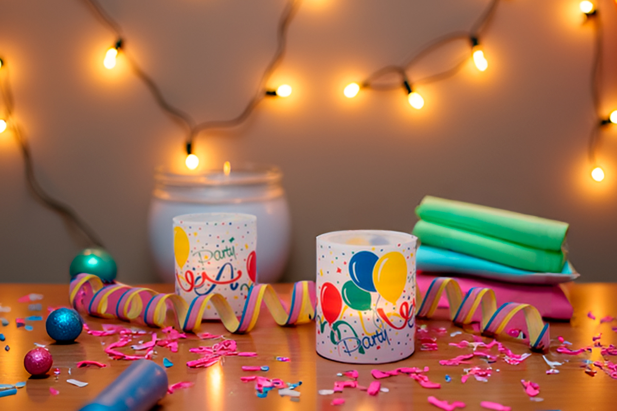 Bringen Sie Stimmung in Ihre Partydekoration mit unserer farbenfrohen Windlicht Banderole für Kerzengläser, verziert mit einem fröhlichen Motiv aus Party Luftballons, Luftschlangen und Konfetti. Diese Banderole besteht aus hochwertigem Transparentpapier mit einer Dicke von 150g/m² und bietet nicht nur eine lebendige Optik, sondern auch eine sichere Umgebung für Ihre Kerzen.