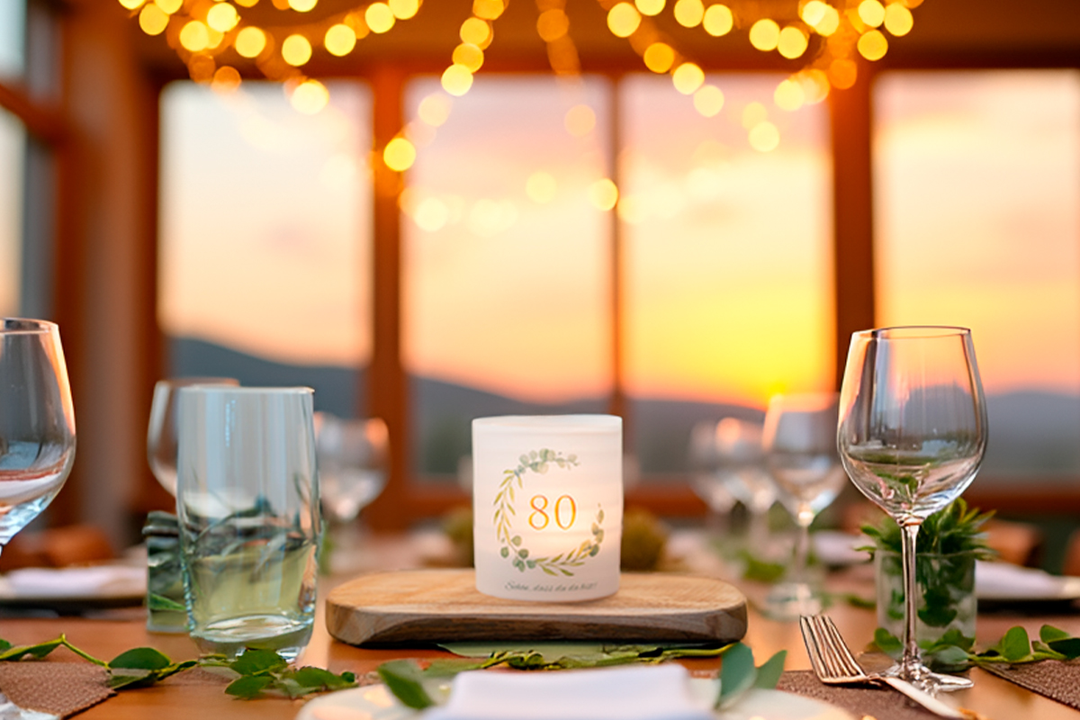 Hergestellt aus transparentem Papier, sorgt die Banderole für eine sanfte Lichtstreuung und schafft eine warme und einladende Atmosphäre, wenn die Kerze angezündet wird. Die goldene "80" fügt einen Hauch von Eleganz hinzu und unterstreicht den besonderen Anlass des 80. Geburtstags.