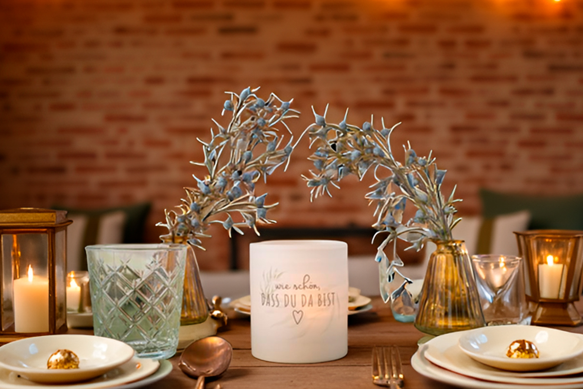 Die Banderole "Wie schön, dass du da bist" ist eine herzliche und einladende Ergänzung für jede Kerze und jeden Anlass. Mit ihrem sanften Hintergrund aus Zweigen und Blättern in blassen Farben, sowie einem Herzsymbol, verleiht sie jedem Kerzenglas eine warme und einladende Atmosphäre und drückt die Freude darüber aus, dass Ihre Gäste anwesend sind.