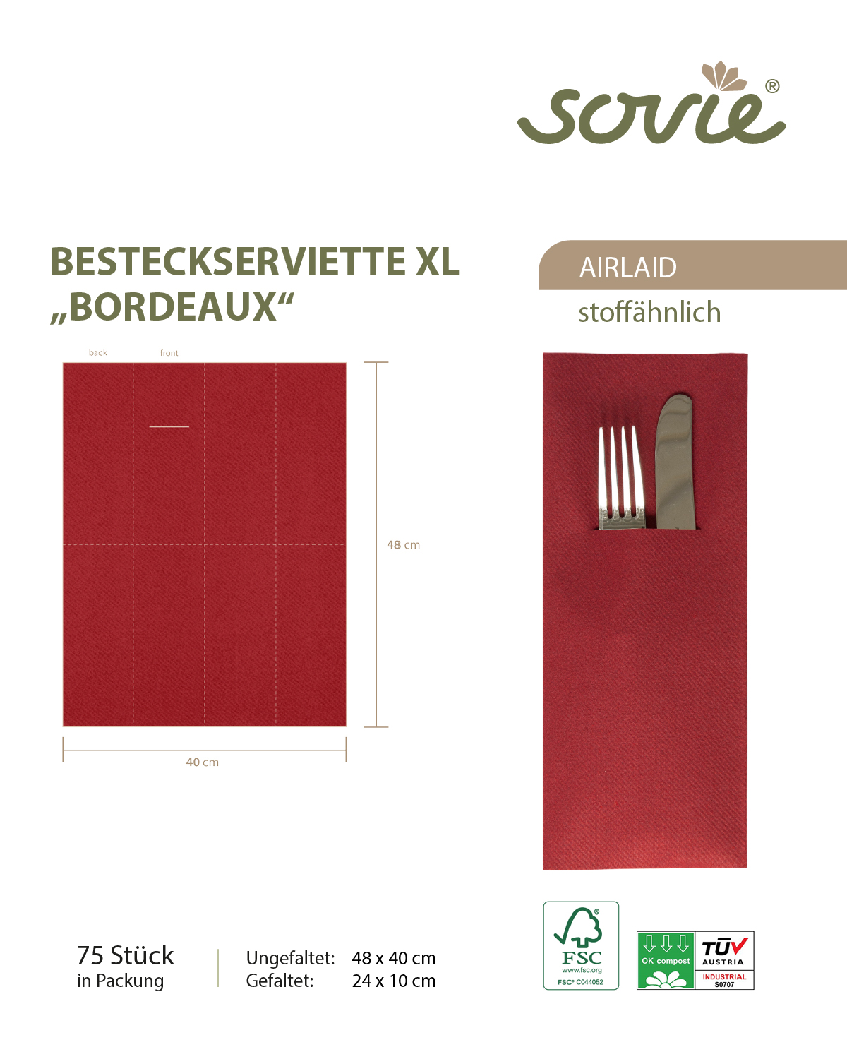 Das 75er-Pack dieser XL Besteckservietten stellt eine wirtschaftliche und dennoch elegante Lösung für professionelle Anwender in der Gastronomie dar. Sie kombinieren Ästhetik, Funktionalität und praktische Anwendung und bieten die perfekte Grundlage, um Ihre Tischdekoration aufzuwerten. Mit der XL Besteckserviette in BORDEAUX aus Linclass® Airlaid schaffen Sie ein stilvolles Ambiente, das sowohl optisch als auch in der Handhabung überzeugt.